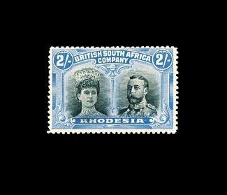 2190 og 112 var. image#112 var., 1910 2/- China blue and black (RSC "D"), thick ear head plate, fresh mint single, strong rich colors of this distinctive and scarce shade, nice sharp impressions, o.g., h.r., a choice stamp with fine centering; 1996 Brandon certificate (S.G. #154 var.). (Image) S.G. £1,000