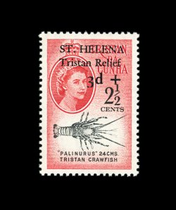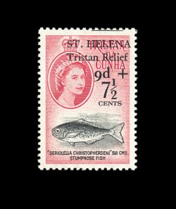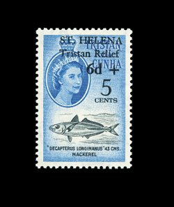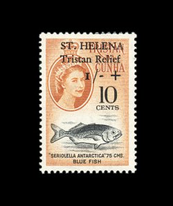 2195 og B1-4 #B1-4, 1961 2 1/2c + 3p to 10c + 1/- Tristan Relief cplt., each stamp is very well centered and with bright colors, o.g., lightly hinged, very fine; one of the key rarities of the Queen Elizabeth era; only 434 sets were sold (S.G. #172-75; £4,000). (image 2195a) (image 2195b) (image 2195c) (image 2195d) 4,750.00