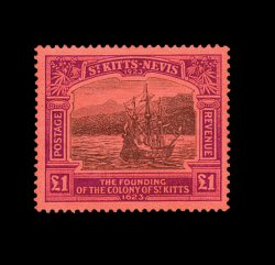 2196 og 64 image#64, 1923 £1 Tercentenary of the Colony, magnificent and nearly perfectly centered example of this high value, the exceptionally pretty combination of the violet and black on red have long made this stamp a favorite, o.g., extremely fine; signed Turpin (S.G. #60; £700). (Image) 800.00