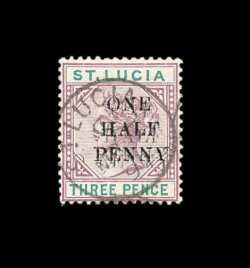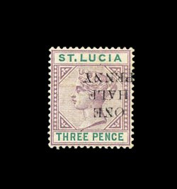 2200 og 40c image#40c, 1892 "One Half Penny" surcharge on 3p Lilac and green, inverted surcharge, a lovely mint example of this seldom seen rarity, uncharacteristically well centered, o.g., lightly hinged, very fine; signed H. Bloch and accompanied by a 1990 RPS certificate; ex-Hind, Melat and Prappas (S.G. #56b; £1,700). (Image) 1,850.00