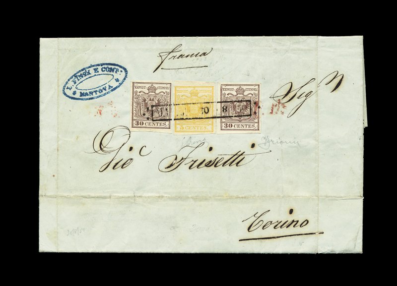 2321 c 1e, 5 #1e, 5, 1850 5c Greenish lemon yellow and two 30c Brown, Ty. I, all three the so-called "First Prints" on hand-made paper, the greenish lemon yellow shade of the 5c is the scarcest shade of these fine prints, all with four attractive full margins, showing fresh colors and extraordinarily clear sharp impressions that distinguish these printings, all tied together and to a lovely 1850 folded entire letter by ornamented boxed "Martova/30-8/50" handstamp, a red "P.D." handstamp also ties the 30c value at right, posted to Torino with red date receiving handstamp of that city on the reverse, in addition to the extremely rare 5c Greenish lemon yellow that was used on this cover, making it a major rarity, the rates from Lombardy-Venetia to various Italian cities were complex and this 65c rate in any combination is not listed by Ferchenbauer, normal file folds to cover, not affecting the stamps or markings, very fine and extremely rare cover; signed E(milio) Diena and one other (Ferchenbauer for just the 5c on cover €11,000+). (Image) Est. 7,500-10,000