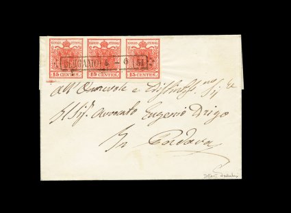 2322 c 4b, 4f image#4b, 4f, 1850 15c Red, hand-made paper, Ty.I-IIa-I, combination horizontal strip of three with the scarce Type IIa being the center stamp with Type I on each side, extraordinarily fresh with bright color in the vermilion red shade, large to extremely large margins all around showing a portion of the spacer bar below the left stamp, beautifully cancelled with perfect central "Bergamo/4-6/51" ornamented boxed cancel, on especially clean folded cover to Padova where backstamped, extremely fine; a very scarce type combination on cover with great eye appeal; 2001 Ferchenbauer certificate describing this as an attractive showpiece; ex-Windner and Linz (Ferchenbauer €2,850). (Image) Est. 1,500-2,000