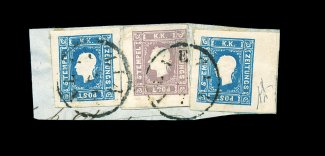 2323 O Austia #P5, P6 imageAustria #P5, P6, 1858-59 (1.05S) Blue, Ty. I and (1.05S) Lilac, Ty. II, two of the scarce 1858 Blue newspaper stamps used in combination with one of the 1859 Lilac on the same piece, tied by two strikes of "Venezia/ 14 7" c.d.s. making this a Lombardy-Venetia usage (these stamps without printed denomination were used in both countries), the two blue values have four extra-large margins, the one at right with 7mm sheet margin at right, the other with small facial scuff at bottom, the lilac stamp has three large to extra-large margins, close but well clear at right, in addition this lilac stamp had been previously affixed to another piece, apparently being unused or uncancelled and was removed and affixed to this piece with the original backing still affixed, this unusual reuse perhaps explains the very rare combination of these two different stamps used on the same piece, impressive and attractive piece; despite the minor condition factors, this piece is of the utmost rarity, Ferchenbauer notes in his handbook that only a single item with both blue and lilac stamps used together had previously been known, that piece was a large part of a wrapper with "Stolzenburg 15 8" cancel, which is a city in Austria, such an item used in Lombardy-Venetia is in theory even scarcer as these stamps were valid for use in Austria until 1864, but were valid in Lombardy-Venetia until only July of 1859, making the window for a combined usage a matter of less than six months, this being used right at the end of that period; signed Friedl and A. Diena, accompanied by a 1954 A. Diena certificate. (Image) Est. 2,000-3,000