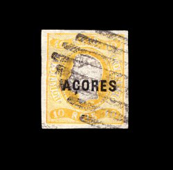 2324 O 2 image#2, 1868 10r Yellow, an outstanding used example of one of the rarest regularly issued stamps in all of the Portuguese Colonies, possessing four large even margins, bright fresh color, grid cancel, extremely fine; this stamp is very difficult to find in any condition, but to find one in this superb quality is truly remarkable; signed A. Brun. (Image) 7,500.00
