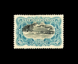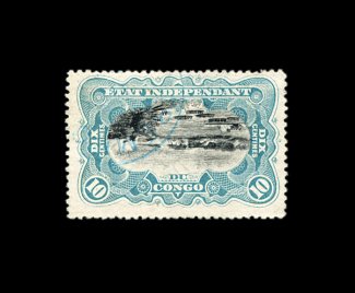 2326 O 18a image#18a, 1895 10c Greenish blue and black, Center Inverted, used, strong rich colors, centered a little to the top as usual, light blue Ibembo cancel, very fine; an attractive example of this error rarity, which is especially challenging to find in used condition; 1948 Commission Belge d'Expertise certificate (Michel #21K; €3,000). (Image) 2,250.00