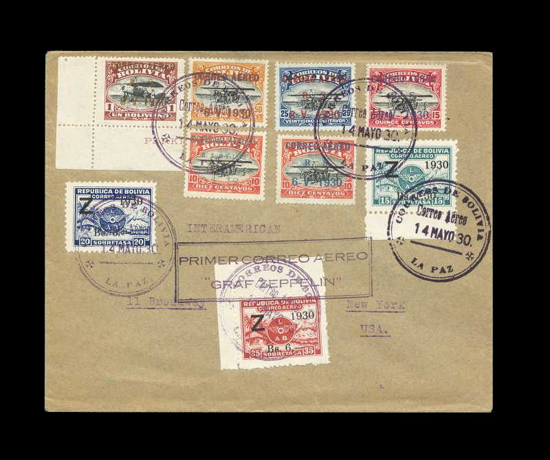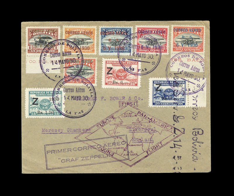 2339 c C24-26 #C24-26, 1930 1.50B-6B Zeppelin surcharges cplt., tied along with the six Air School overprints by La Paz c.d.s. postmarks to Pan-American Zeppelin cover (Sieger #60D), addressed to England, both black Bolivian flight cachets as well as the violet United States flight cachet, Friedrichshafen backstamp, very fine and scarce; ex-Gruys. (Image) Est. 500-750