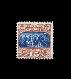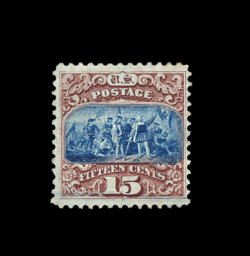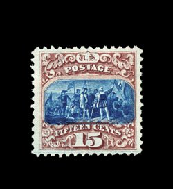1121 ng 118 image#118, 15c Brown and blue, Ty. I, a fabulous unused example which possesses, unquestionably, the finest centering and margins we have ever seen on this rare stamp, with uniformly immense margins all around, plus its colors and impression are truly prooflike, an extremely fine gem; even despite the lack of gum, this stamp has to be considered among the best quality examples of Scott #118 in existence, as this value is notorious for its usual lack of sizable margins and attractive centering; 1977 and 1992 PF certificates; ex-Anderson. (Image) 3,750.00
