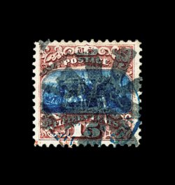 1123 O 118 var. image#118 var., 15c Brown and blue, Ty. I, double grill variety, a stunning used example of this variety, being in a condition that would be extraordinary for a normal example of this difficult stamp, let alone this elusive variety, incredibly well centered within uncommonly large margins, bright fresh colors, two strong and distinct grill impressions slightly overlapping, beautifully postmarked with a central strike of an unusual rosette cancel in black, plus portions of red and blue transit pmks. as well, extremely fine; a marvelous stamp for the 1869 specialist; 2001 PF certificate. (Image) 1,005.00