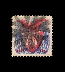 1129 O 121 image#121, 30c Blue and carmine, a gem used example which possesses extraordinary overall physical qualities, including being flawlessly centered amid extravagantly large margins, plus both of its colors are unusually strong and rich, beautifully postmarked with a perfect strike of a circle of "V's" cancel, extremely fine; a lovely used Thirty Cent 1869 Pictorial; 1991 PF certificate. (Image) 550.00