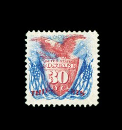 1130 og 121a image#121a, 30c Blue and carmine, without grill, a pristine example of this important 1869 Pictorial rarity, possessing an overall freshness and brilliance rarely associated with the without grill varieties, gloriously rich colors and clean crisp impressions on immaculate paper, quite well centered, full o.g. which is much cleaner than typically found, lightly hinged, very fine and exceedingly choice; approximately 50 examples of this rarity have been certified, nearly half of which are contained in blocks of four or larger; 2003 PF certificate. (Image) 11,000.00