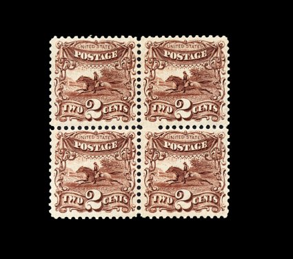 1135 ogbl 124 image#124, 2c Brown re-issue, a marvelous quality mint block of four, possessing exceptional margins and centering, rich luxuriant color and a crisp impression, full o.g., relatively lightly hinged, very fine-extremely fine; re-issue multiples of any of the values are true rarities, with this particular block believed to be the finest of the few known Two Cent blocks; 1970 and 1992 PF certificates; ex-Hetherington and Anderson. (Image) 4,000.00