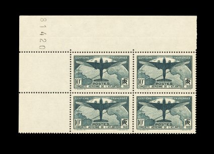 2442 nhbl C16-17 image#C16-17, 1936 1.50Fr-10Fr South Atlantic Flight cplt. in corner sheet-margin control blocks of four, the 10Fr value is exceptionally well centered, o.g., n.h., 10Fr with few perf. separations at top, very fine-extremely fine; 2001 Roumet certificate for the 10Fr value (Yvert #320-21, for singles €2,940). (Image) for singles 1,884.00+