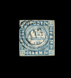 2449 O 16 image#16, 1864 1 1/4S Blue and grey, Type II, an outstanding premium used example of this very scarce type, possessing four well clear to large margins all around, strong color, nicely complemented by three-ring "113" numeral cancel of Altona, extremely fine; a rare stamp that is rarely found in any condition let alone as select as this; double signed Pfenninger and accompanied by his 1971 certificate, which is also signed by Maria Brettl and Joh. Ulrich Schmidt (Michel #5II; €4,000). (Image) 2,250.00