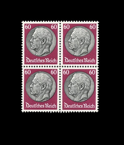 2454 nhbl 401-14 image#401-14, 1933 3pf-100pf Hindenburg cplt. in mint blocks of four, exceedingly fresh, with bright vibrant colors on pristine white paper, o.g., n.h., very fine; actually quite rare to find a choice never hinged set of blocks of this set, especially in this country (Michel #482-95; €4,400+). (Image) 3,200.00+