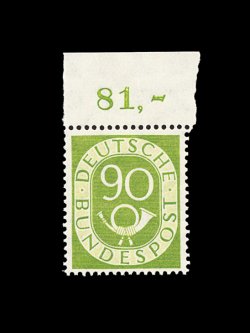 2455 nh 670-85 image#670-85, 1951-52 2pf-90pf Posthorns cplt., each is a top sheet-margin single with control number in the margin, wonderfully bright and fresh, o.g., n.h. (15pf with minor gum bends), a very fine and well matched set (Michel #123-38; €2,500). (Image) 1,650.00