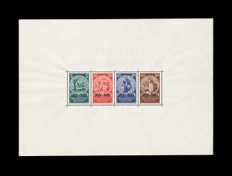 2456 nh B33 image#B33, 1930 International Philatelic Exhibition souvenir sheet, pristine sheet, remarkably fresh, o.g., n.h. (trivial gum skip on one stamp), extremely fine (Michel Block #1; €1,500). (Image) 875.00
