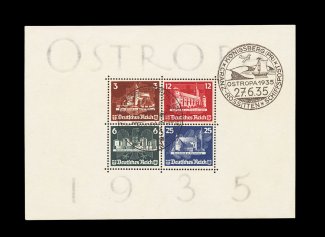 2459 O B68 image#B68, 1935 Ostropa souvenir sheet, an incredibly fresh used example, deep intense colors on brilliantly white paper, usual exhibition cancels, without any of the flaws that affect so many of these sheets, extremely fine and choice (Michel Block #3; €900). (Image) 650.00