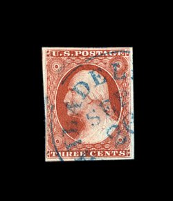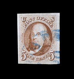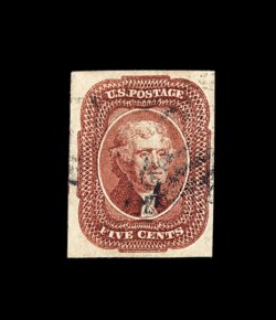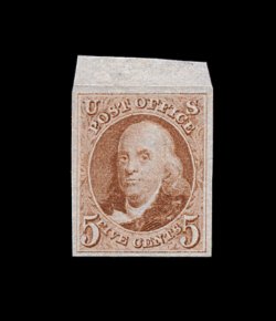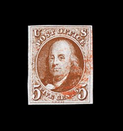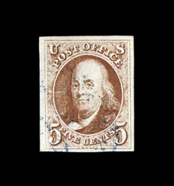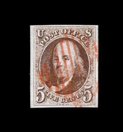 3 O 1 image#1, 5c Red brown, an extraordinarily handsome example featuring the most intense and dark red brown color we have seen (from the first delivery of 1847 issues per Wade Saadi), remarkably detailed early impression, full to large margins all around, light strike of red grid cancel, very fine and choice; 1986 PF certificate; ex-Granzow. (Image) 550.00