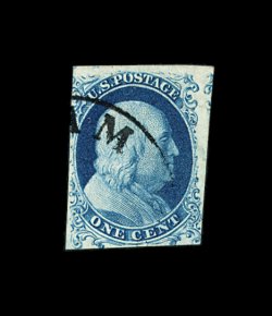 10 O 6 image#6, 1c Blue, Ty. Ia, bright used single, margins ranging from extra large, showing small portion of next stamp at right, to just into the design at top left, substantially showing the full scrolls at bottom, which are characteristic of this type, luxurious color with a detailed impression, neat small portion of black town cancel, nearly very fine; 1996 PF certificate. (Image) 10,000.00