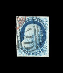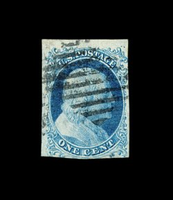 9 O 5A image#5A, 1c Blue, Ty. Ib, position 4R1E, a remarkably handsome example of this scarce type that only comes from the top row of plate 1, with portion of the top sheet margin, showing the full design characteristics at top which identify this type, mostly large other margins as well, just touching at a couple points, bright and exceptionally pretty shade of blue that is found in the early state of this plate, and set on fresh white paper, black grid cancel, very fine and desirable example of this scarce stamp; 1988 PF certificate. (Image) 6,750.00