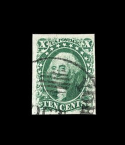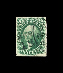 17 O 13 image#13, 10c Green, Ty. I, delightful used single bearing a neat portion of New York ocean mail c.d.s., four large to extra-large margins, intense green color on fresh bright paper, extremely fine; 1997 PF certificate. (Image) 800.00
