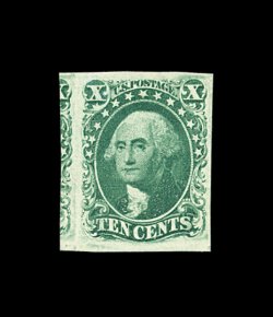 18 ng 15 image#15, 10c Green, Ty. III, a particularly lovely unused single, marvelously well margined showing a substantial portion of the next stamp at left, sumptuous bright color and particularly fresh despite the accompanying certificate that states, "tiny toned spots and tiny discolored spots at top left," these are so miniscule as to require high magnification to find them, extremely fine unused example that is hard to find this pretty and choice; 2002 PF certificate. (Image) 2,000.00