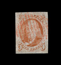 5 O 1c image#1c, 5c Red orange, a desirable used example of this distinctive and very rare shade, possessing the unmistakable red orange color that is attractively complemented by a red diamond grid cancel, beautifully set within four full even margins, accompanying certificate states "small corner crease at top left", we think this refers to a miniscule corner-tip crease at top right, which can only be mentioned for the sake of total accuracy, otherwise extremely fine; while most of the very few known examples of this rarest of all the 1847 colors have small faults, this is a remarkably choice example of this elusive color and regardless of condition missing from most major collections; 2000 PF certificate. (Image) 6,000.00