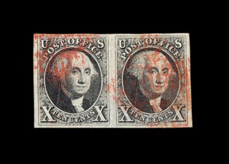 7 O 2 image#2, 10c Black, attractive horizontal pair, with four large even margins, red grid cancels, detailed impression, right stamp with tiny tear at top center not apparent from the face, left stamp sound and very fine; 2002 PF certificate. (Image) 3,250.00