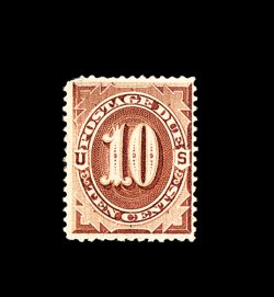 181 og J12 image#J12, 10c Deep brown special printing, quite well centered mint example with all perforations well clear of the design, distinctive deep brown color and a highly detailed impression, certificate mentions tiny perf. thins at top, but in addition it now has a rounded corner and a barely detectable closed tear at bottom, otherwise very fine centering; only approximately 174 examples ever reached the public; 1968 PF certificate. (Image) 4,500.00