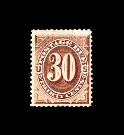 182 ng J13 image#J13, 30c Deep brown special printing, unusually well centered unused single with large to extra-large margins, rich deep distinctive color and well incised impression, thin corner perf. at top left and tiny edge tear between perfs. at top right, neither detracting from this rare stamp's choice very fine appearance; the example offered here has wonderful attractive appearance that far exceeds the vast majority of the approximately 179 examples that were believed to have been issued, and most of those have faults of varying degrees as well; 1998 PF certificate. (Image) 4,500.00