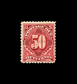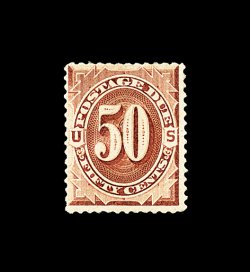 189 og J50 image#J50, 50c Deep claret, unusually fresh and crisp mint single, brilliant deep color with a prooflike impression, quite well centered for this exceptionally scarce high value, o.g., lightly hinged, nearly very fine. (Image) 1,100.00