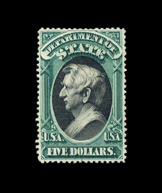 194 og O69 image#O69, $5.00 State, attractively centered example of this key high value, exceptionally deep colors with strong sharp impressions, disturbed part o.g., very fine and a very difficult stamp to find as nice as this. (Image) 6,000.00