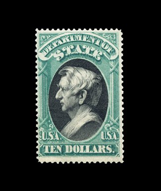 195 og O70 image#O70, $10.00 State, unusually fresh mint single, with bright colors and clean sharp impressions, full o.g. that is lightly hinged, well centered though reperforated at left, very fine appearance. (Image) 4,500.00