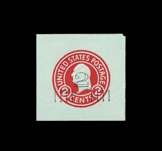 247 og U457 image#U457, 2c on 2c Carmine on blue, die 6, fresh full corner mint cut square, measuring 41x40mm, strong color with clear surcharge, extremely fine. (Image) 350.00