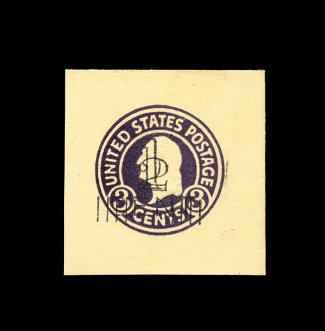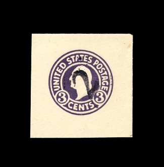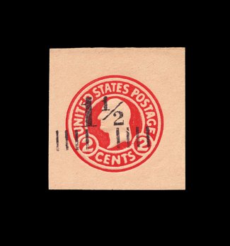246 og U453 image#U453, 2c on 2c Carmine on white, die 3, type 3 surcharge, mint cut square, being a full corner example which measures a large and perfectly balanced 52x52mm, very faint and barely noticeable toning at top and right, otherwise extremely fine; an extremely rare surcharged cut square that did not change the denomination as was the purpose of the overprint, seldom offered and certainly one of the more attractive of the few that exist; 2003 PF certificate; ex-Ballman. (Image) 4,250.00