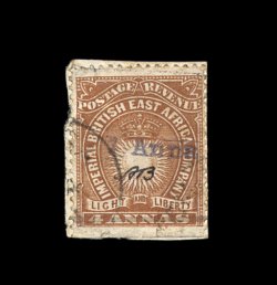 322 O 33a image#33a, 1891 "1/2 Annas" manuscript surcharge on 2a vermilion, bottom left corner single, bright color, neat Mombasa c.d.s., small thin, fine appearance; the normal provisional itself is rare, but this "Annas" error is very seldom offered; 1998 APS certificate (S.G. #23a; £950). (Image) 1,200.00
