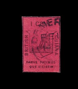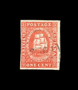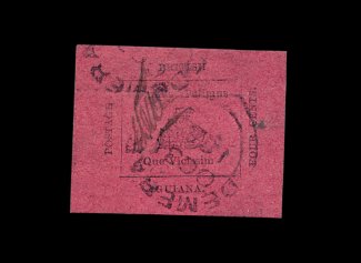 325 O 14 image#14, 1856 4c Black on magenta, a remarkable appearing used example of this classic rarity, possessing phenomenal margins all around, light but neatly struck "Demerara/OC 31 185(6)" c.d.s., some minor flaws which have been expertly restored and painted in, nevertheless a very fine appearing and striking example; 2001 BPA certificate (S.G. #24; £6,000). (Image) 7,500.00