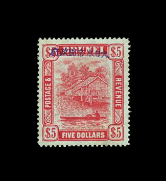 328 ng N18 image#N18, 1944 $5.00 Carmine on green with violet occupation Japanese overprint, choice centering, small part o.g., very fine and scarce; 1969 PF certificate (S.G. #J18; £850). (Image) 900.00