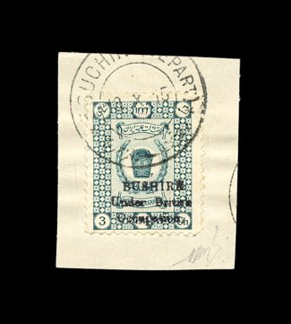 330 O N17 image#N17, 1915 3ch Dark green, strong color and very well centered for this, tied to piece by Oct. 15, 1915 "Bouchir (Depart)" c.d.s., very fine; only 149 issued; signed H. Bloch and accompanied by a 1978 BPA certificate (S.G. #17; £400). (Image) 400.00