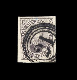 336 O 10 image#10, 1857 6p Reddish purple on very thick soft wove paper, cold shade and sharp impression, large to huge margins all around, bold Montreal four-ring "21" numeral cancel, faint trace of corner crease at top left, still very fine; 2002 PF certificate (S.G. #23; £2,500, Unitrade C$6,500.00). (Image) 4,000.00