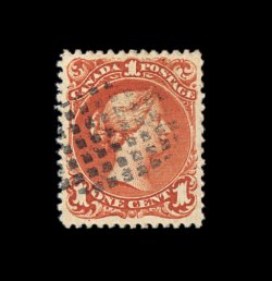 338 O 31 image#31, 1868 1c Brown red on laid paper, a choice appearing used example of this rare stamp, extravagantly large margins which are most uncharacteristic and being exceptionally well centered within them, sumptuously rich color and a crisp impression, small tear at right, extremely fine appearance; clear 1998 APS certificate (S.G. #55a; £1,600, Unitrade C$8,000.00). (Image) 3,250.00