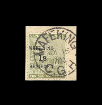 339 O 166 image#166, 1900 "Mafeking/1s./Besieged" on 4p Pale olive green, tied to piece by Mafeking c.d.s., very fine (S.G. #5; £325). (Image) 325.00