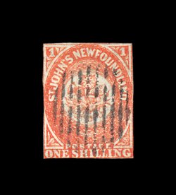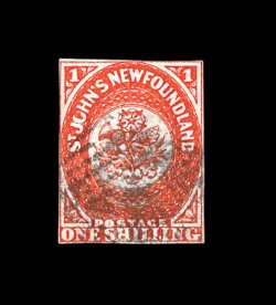 421 O 9 image#9, 1857 1/- Scarlet vermilion, used, close but clearing margins all around, especially strong color and impression, a completely sound and fine example of this rare stamp; 1985 PF certificate (S.G. #9; £4,750, Unitrade C$5,000.00). (Image) 5,000.00