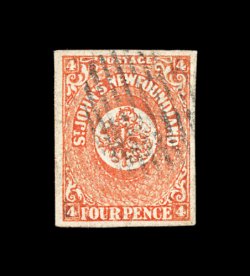 422 O 12 image#12, 1857 4p Orange, a most impressive used single, with four large even margins, bright color, lightly cancelled, extremely fine; 1958 Hunziker certificate (S.G. #12, £800, Unitrade C$1,500.00). (Image) 1,000.00