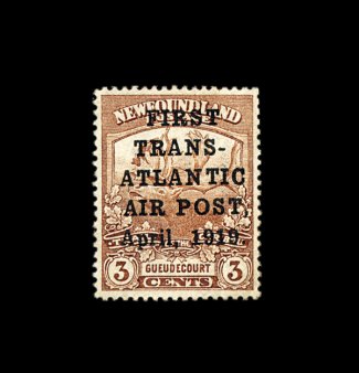 424 og C1 image#C1, 1919 3c Brown, with "First/Trans-/Atlantic/Air Post/April, 1919." overprint, the so-called "Hawker" air post stamp, a handsome appearing mint example of this air post rarity, possessing the finest centering possible, rich color, with the typical postmaster's "J.A.R." initials on reverse, o.g., lightly hinged, trivial corner crease at top right, certificate also states "slightly soiled" which is completely unworthy of mention, extremely fine appearance; signed Bloch, Kessler, Sanabria, and accompanied by a 2000 BPA certificate (S.G. #142; £15,000, Unitrade C$30,000.00). (Image) 15,000.00