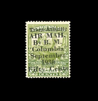 425 og C5 image#C5, 1930 50c on 36c Olive green "Columbia" Flight overprint, deeply rich color and an unusually strong impression on fresh white paper, nicely centered for this, full clean o.g., lightly hinged, very fine; a highly desirable example of this rare air post stamp, of which only 300 were printed; signed Kessler and accompanied by a 1974 PF certificate; ex-Grunin (S.G. #191; £4,750, Unitrade C$12,000). (Image) 7,000.00