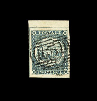 426 O 3a image#3a, 1850 2p Gray blue on yellowish wove, early impression, position 8, with sheet-margin at top, other margins also very large, deep intense color and impression from the early printing, "3" in oval grid cancel of Windsor, extremely fine; an especially handsome example; 1993 APS certificate (S.G. #15; £400). (Image) 360.00