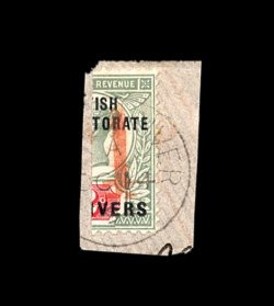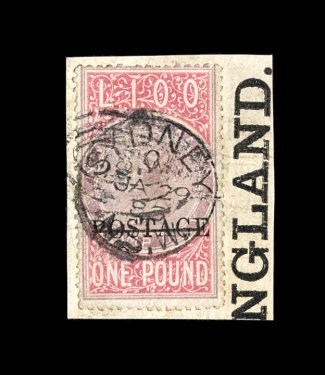 427 O 74a image#74a, 1885 £1 Rose and violet, perf. 13, on piece, with centrally struck Sydney c.d.s., light soiling mostly along the perf. edges, otherwise a fine example of this rare stamp; 2002 APS certificate (S.G. #240; £2,250). (Image) 2,100.00