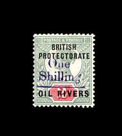 437 og 29 image#29, "One/Shilling." Violet surcharge on 2p, exceptionally fresh, with rich bright color on clean white paper, o.g., lightly hinged, very fine; signed Champion (S.G. #37; £400). (Image) 400.00