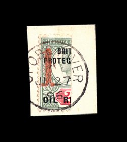 438 O 50 #50, 1894 "1" Red surcharge on half of 2p, two examples that represent both halves of the same original stamp that were used at two different times (left stamp with July 27 pmk., right stamp with Oct 14 pmk.), each tied to piece, fresh colors, very fine; this is probably the first time these have been offered as a reunited pair, as Dr. Johnson purchased the right stamp in our September 2000 sale of the Gibralter collection; left stamp with 1996 Brandon certificate, right stamp with 1981 BPA certificate (S.G. #59; £600). (image 438a) (image 438b) 700.00